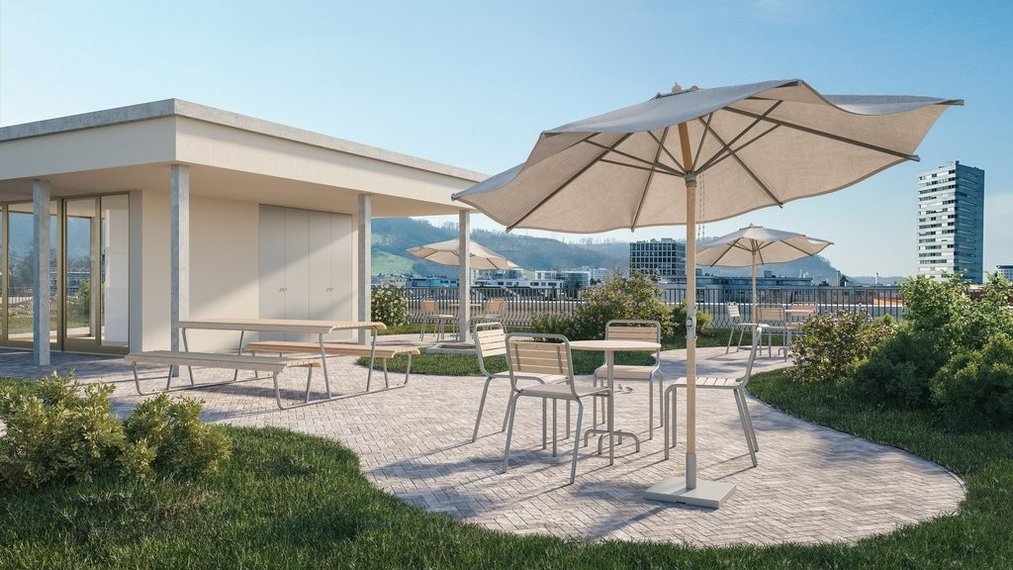 Die Wohnsiedlung bietet eine perfekte Balance zwischen Natur und städtischer Anbindung. Dank der vielfältigen Wohnungsangebote und der gemeinschaftlichen Dachterrasse entsteht hier ein lebendiger Begegnungsort.