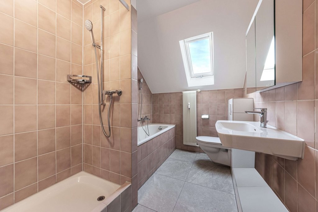 Nasszelle mit Badewanne, Dusche, Doppellavabo und Fenster