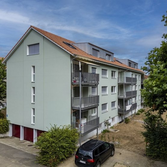 Diese grosszügige, helle und moderne Maisonette-Wohnung befindet sich in einem gepflegten Mehrfamilienhaus mit vier Parteien. Die Bushaltestelle ist direkt vor dem Haus. Schulen, Kindergarten und Einkaufsmöglichkeiten sind gut mit dem Tram oder Bus zu erreichen. Die Umgebung bietet viel Freiraum zum Spielen und Verweilen.