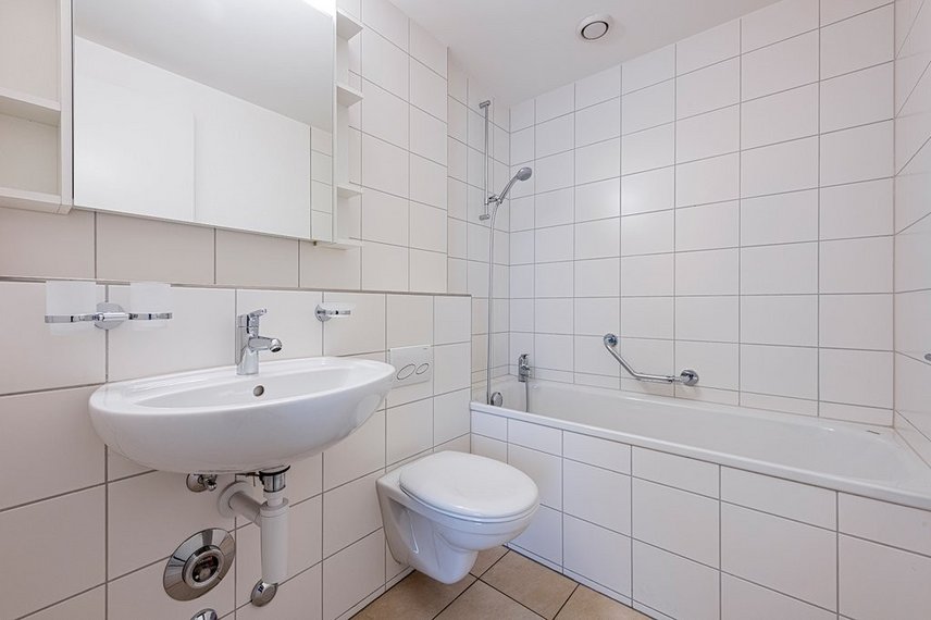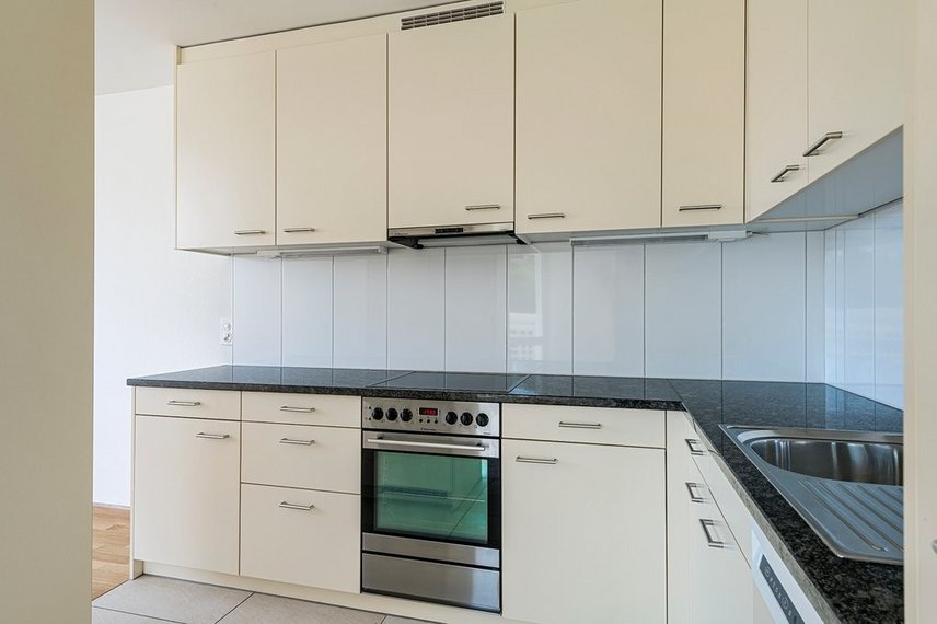 Die Nasszelle, Küche und Gangzone sind mit Feinsteinzeugplatten versehen